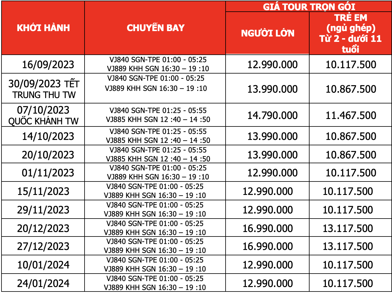 Trưởng đoàn đón Quý khách tại sân bay Tân Sơn Nhất để làm thủ tục đáp chuyến bay đi Đài Loan. Đến sân bay Đài Bắc (Đào Viên) Hướng dẫn viên đón đoàn. Chào mừng Quý khách đến với Đài Loan. Quý khách sẽ ngủ trên máy bay.