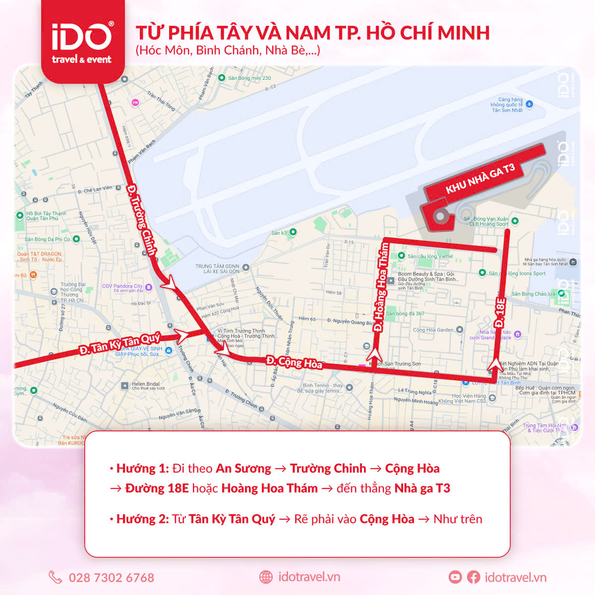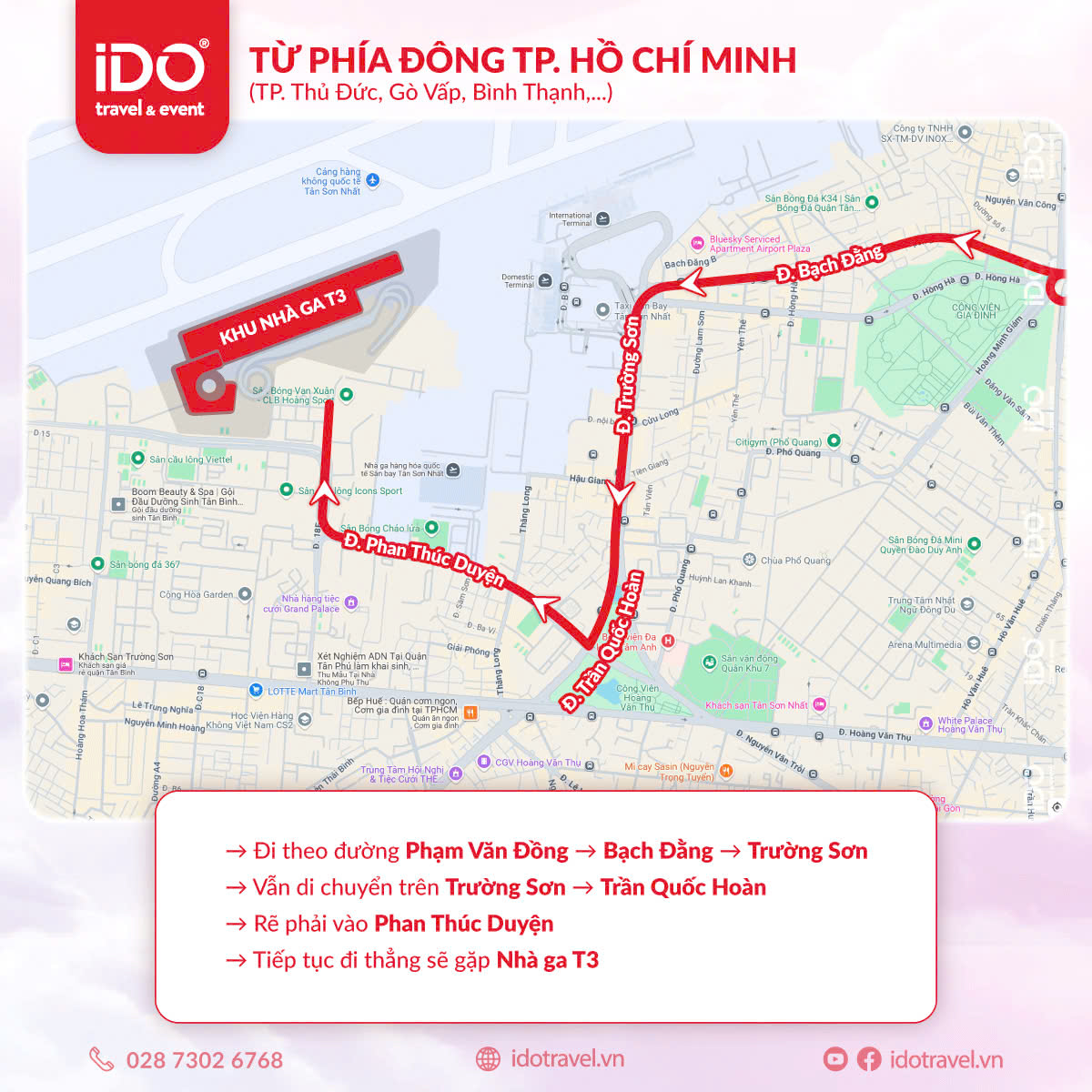 ▪️ Hành khách từ Bình Dương, Đồng Nai, TP Thủ Đức có thể đi theo trục Phạm Văn Đồng - Bạch Đằng - Trường Sơn - đường nối Trần Quốc Hoàn đến nhà ga T3.