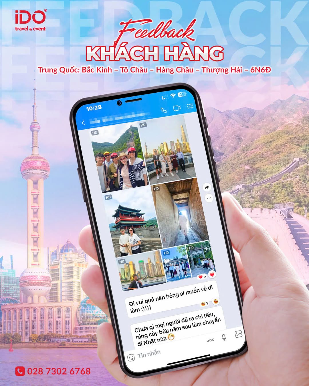 Đầu tháng 7 vừa qua, IDO travel vinh dự đồng hành cùng đoàn gia đình trong chuyến du lịch Trung Quốc. Chuyến đi kéo dài 6 ngày 6 đêm, đưa các thành viên từ Bắc Kinh cổ kính đến Thượng Hải hiện đại, ghé qua Tô Châu – Hàng Châu thơ mộng.