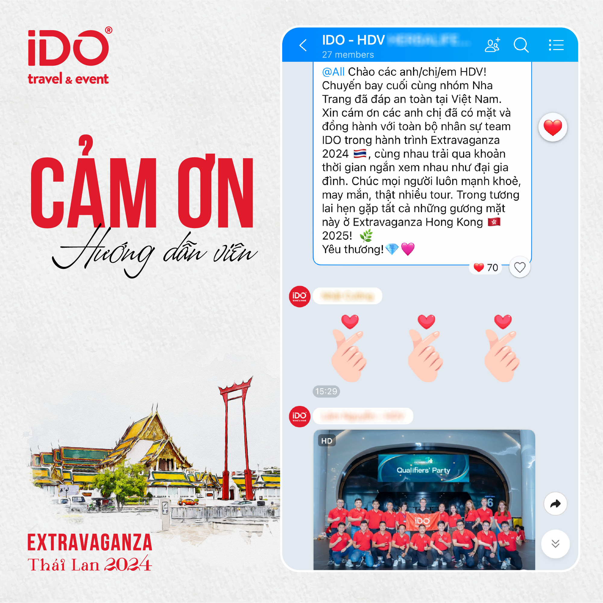 IDO gửi lời cảm ơn và trân trọng đến các Quý đối tác, Anh Chị Em Hướng dẫn viên đã đồng hành và hỗ trợ nhau cùng hoàn thành chương trình du lịch kết hợp sự kiện Extravaganza tại Thái Lan.