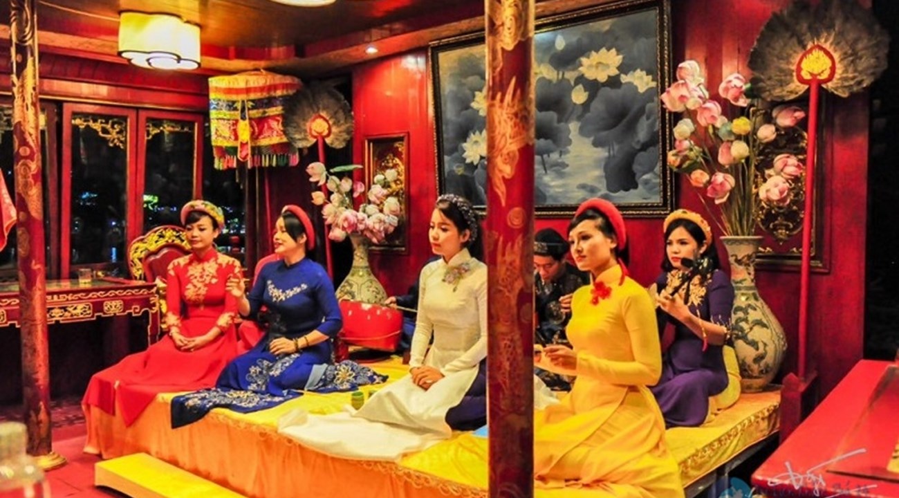Xe đưa khách đến sông Hương, khách dùng bữa tối trên thuyền và thưởng thức ca Huế trên dòng sông Hương.